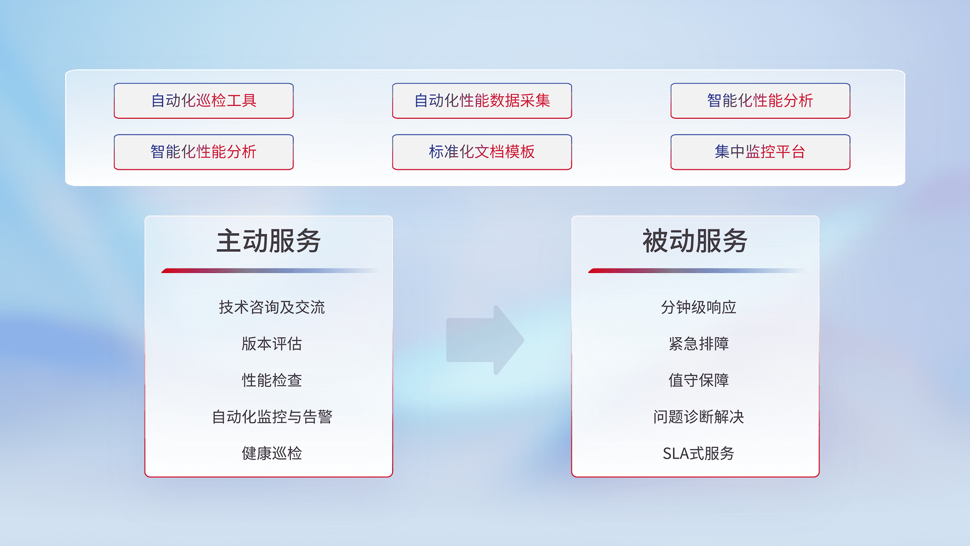 智能化工具和标准化文档,,保障服务质量,,提供主动服务(包含技术咨询、、、版本评估、、、、性能检查、、、、自动化监控与告警、、、、健康巡检)和被动服务包含(分钟级响应、、、、紧急排障、、值守保障、、问题诊断解决、、SLA服务)。。